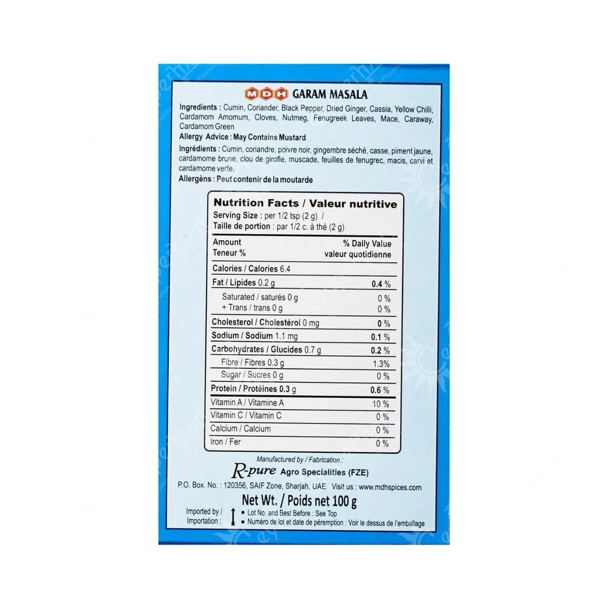 Ingredients :  Coriander seeds, Cumin, Black Pepper, Cassia, Dried Ginger, Fenugreek Leaves, Cardamom Amomum, Yellow Chillies, Cloves, Nutmeg, Mace.