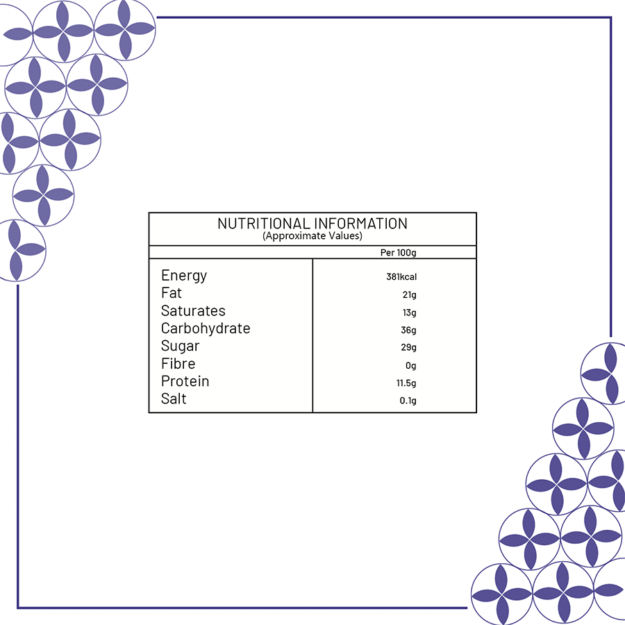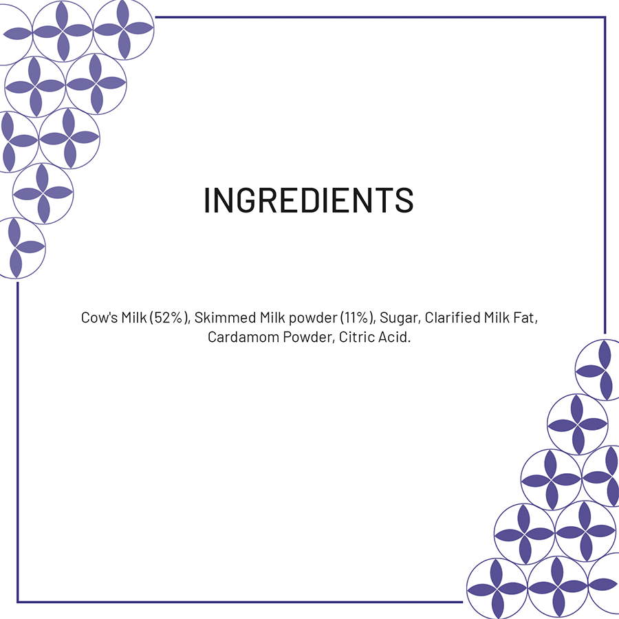 Cow Milk, Sugar, Skimmed Milk Powder, Clarified Milk Fat, Cardamom Powder, Citric Acid.