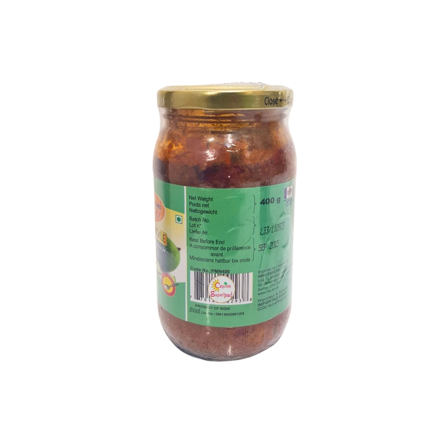 Ingredients: Green Mango, Chille Powder, Garlic, Ginger, Seasame oil, Cummin Seed, Fennel Seed, Saffron, Mustard, Dill-Seed, Suger, Salt and Vinegar.