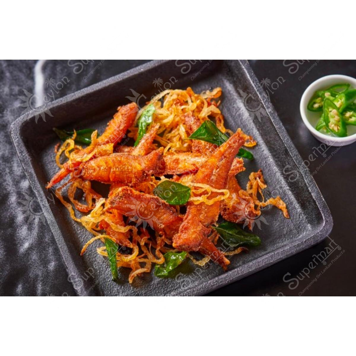 Fried anchovies tossed with onion & chilli.