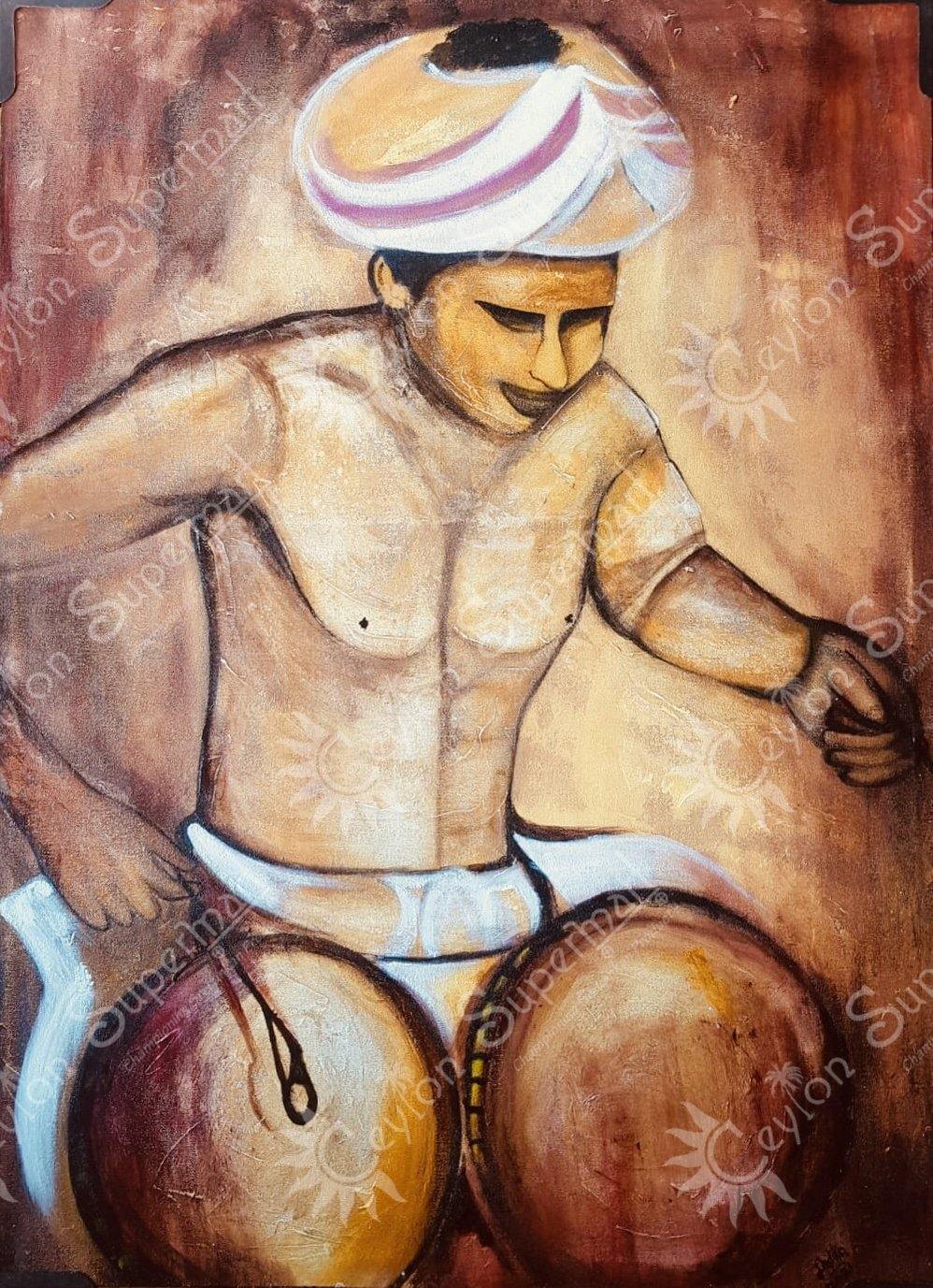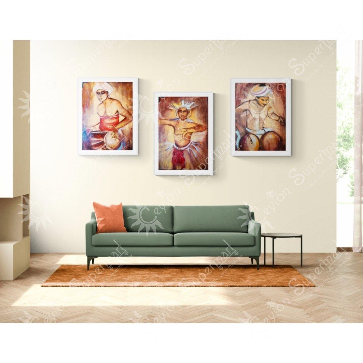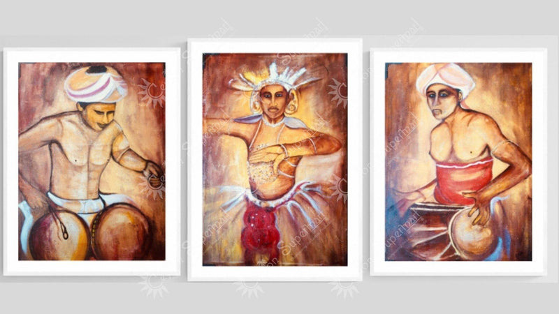 Original Sri Lankan Wall Art Kandyan Drummers and Dancers Oil Painting, Set of 3