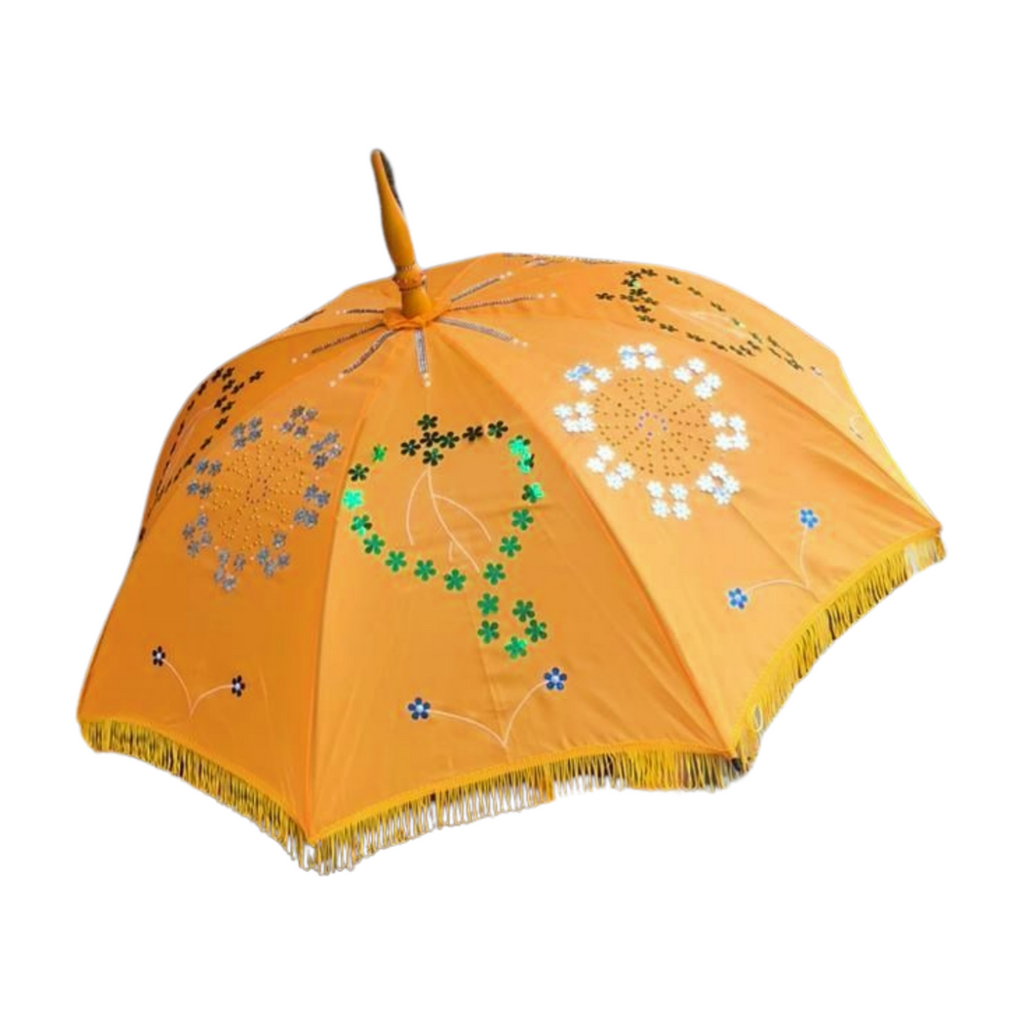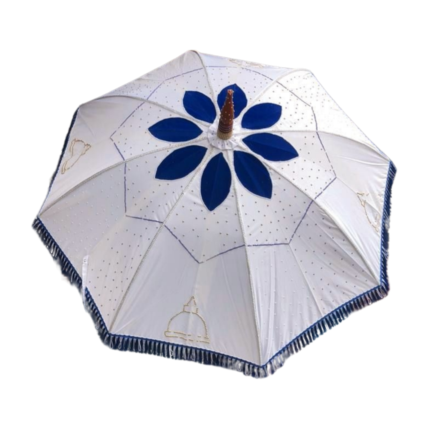 Furthermore, Muthu Kuda designs often incorporate different Buddhist symbols, such as the Sacred Bodhi Tree Leaf, the Dharma Wheel, the Lotus Flower, and the Conch Shell. Some of these designs are lavishly adorned with sequins, adding a radiant touch to the umbrellas.